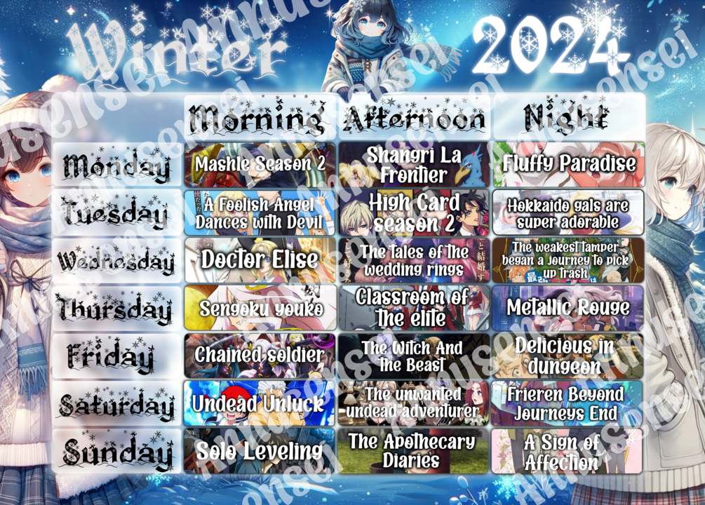 - images of all the posters for anime which are going to be released in winter 2024 segregated into each day